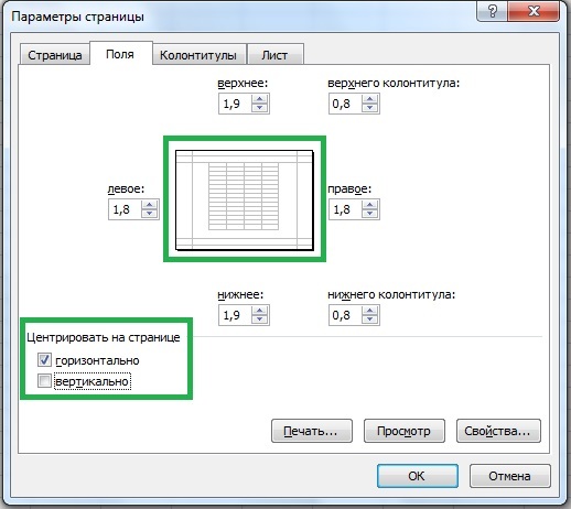 На скриншоте показано центрирование горизонтально, когда от таблицы до краев листа слева и справа одинаковое расстояние. Если ставить и снимать галочки напротив этих пунктов Горизонтально и Вертикально, то выше можно увидеть, как это будет выглядеть на листе.