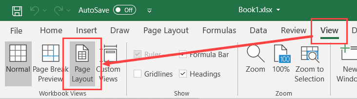 2. В группе «Просмотры книги» выберите параметр «Макет страницы». Это изменит способ отображения данных (и вы увидите шкалы вверху и слева от листа).
