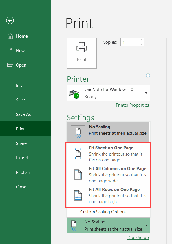 Параметр «Уместить лист на одной странице» подходит, когда у вас есть только несколько строк / столбцов, которые перекрывают друг друга. Если их много, использование этой опции может сделать печатаемые данные слишком маленькими для чтения.