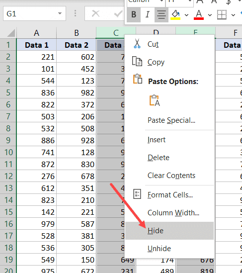 Чтобы скрыть строку / столбец, просто выберите их, щелкните правой кнопкой мыши и выберите «Скрыть».
