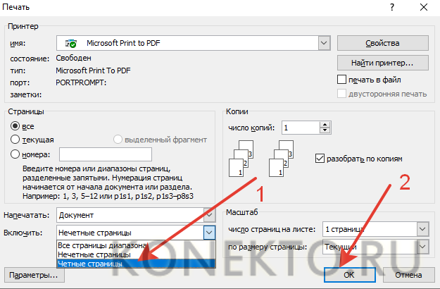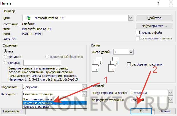 • Указываем все необходимые настройки (число копий, выбор принтера и т.д.), после чего в разделе «Включить» выбираем пункт «нечетные страницы» и подтверждаем действие.