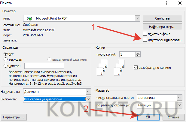 • Выбираем принтер, ставим галочку напротив «двухсторонняя печать» и подтверждаем действие.