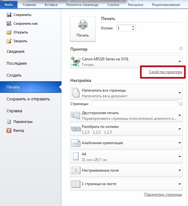 • Заходим в меню печати.