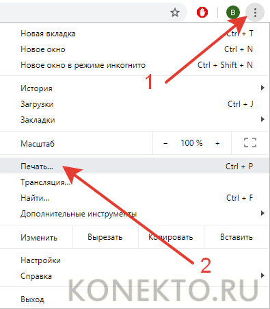 • Открываем страницу, заходим в настройки браузера и нажимаем на кнопку «Печать».