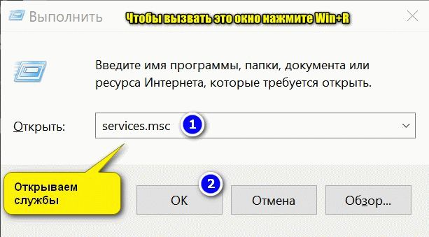 Зайдите в оснастку «Службы» используя ее инициализацию через окно запуска программ (кнопка «Виндовс» и клавиша R одновременно) и команды «services.msc».